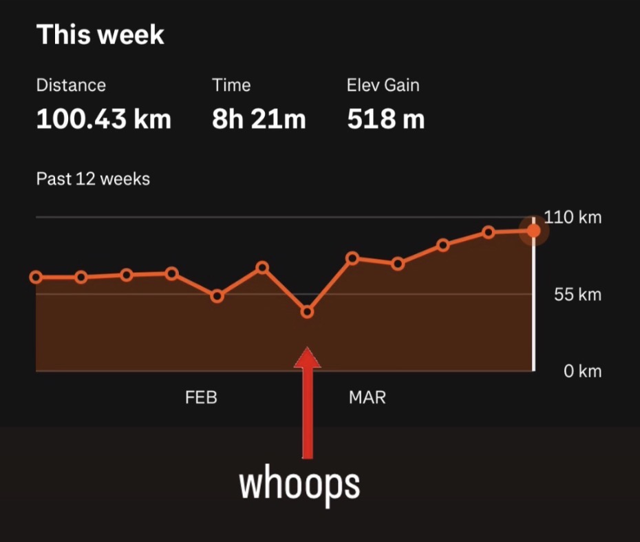 I surpassed 1,000 kilometres ran, year-to-date, on April 4 — the earliest that I ever have (so far?). This capped off a four-week block with an average 95 km ran per week. The only blip in this training cycle came a few weeks ago on Family Day when I put my back out being an old man and then (learning from past mistakes) didn’t panic, but rather took it easy and let it resolve, finishing the week with just 42.5 km total, with one longer workout coming on the Sunday.